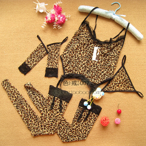 Sexy Leopard Print women's fun underwear perspective mesh one piece silk stockings 6 piece suit