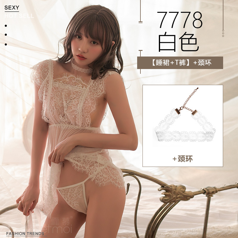 Eyelash lace perspective seductive sexy backless pajamas nightdress set
