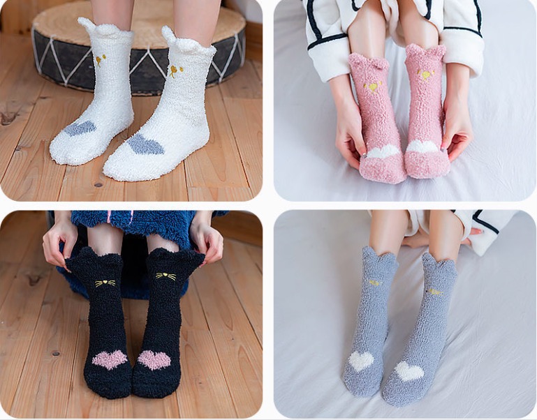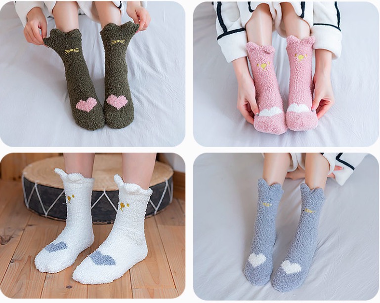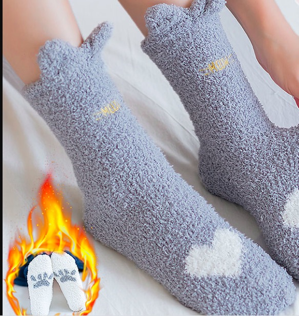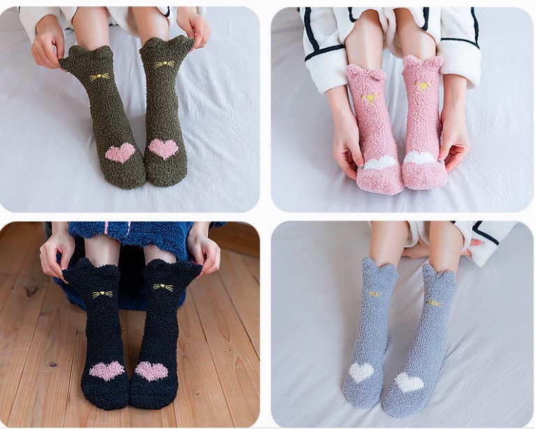 Cute Cat Coral Velvet Sleep Socks Women Plus Velvet Thick Tube Socks Winter Warm Home Sleeping Floor Socks