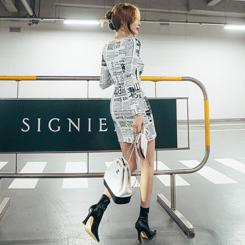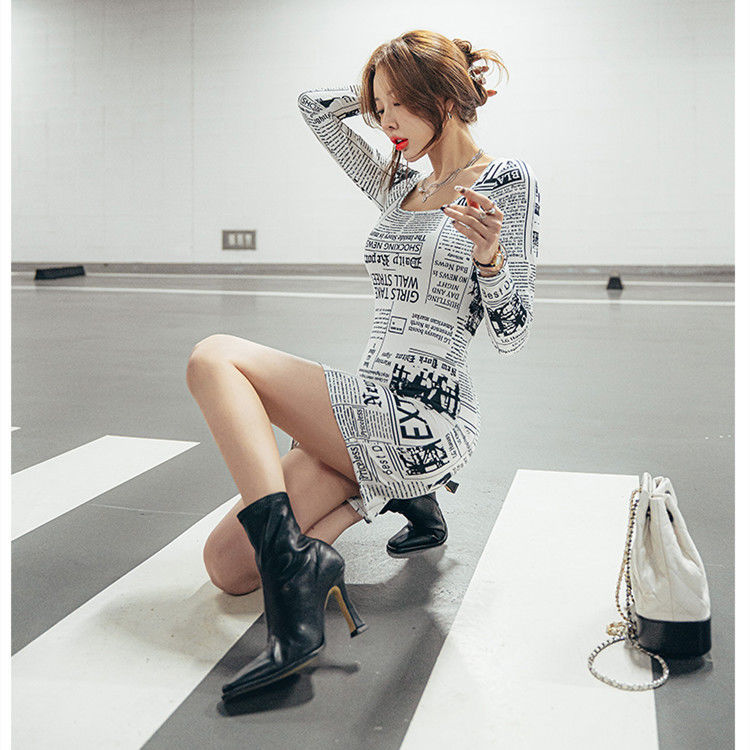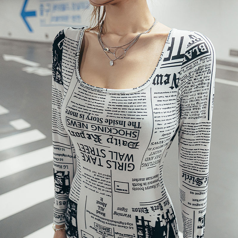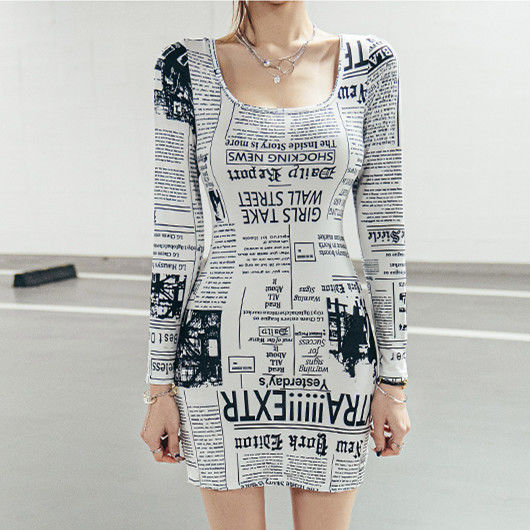 Fashion Long Sleeve Newspaper Printed Off Shoulder Dress