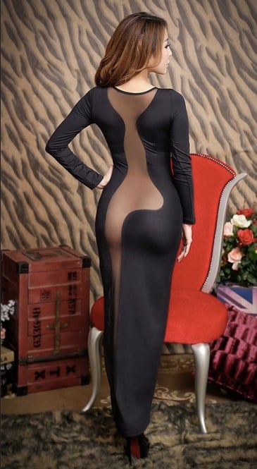 Women Black Long Dress Robe Nightwear Lady Slips Patchwork Mesh See Throught Dress Back Hollow Out Party Night Club Sleepwear