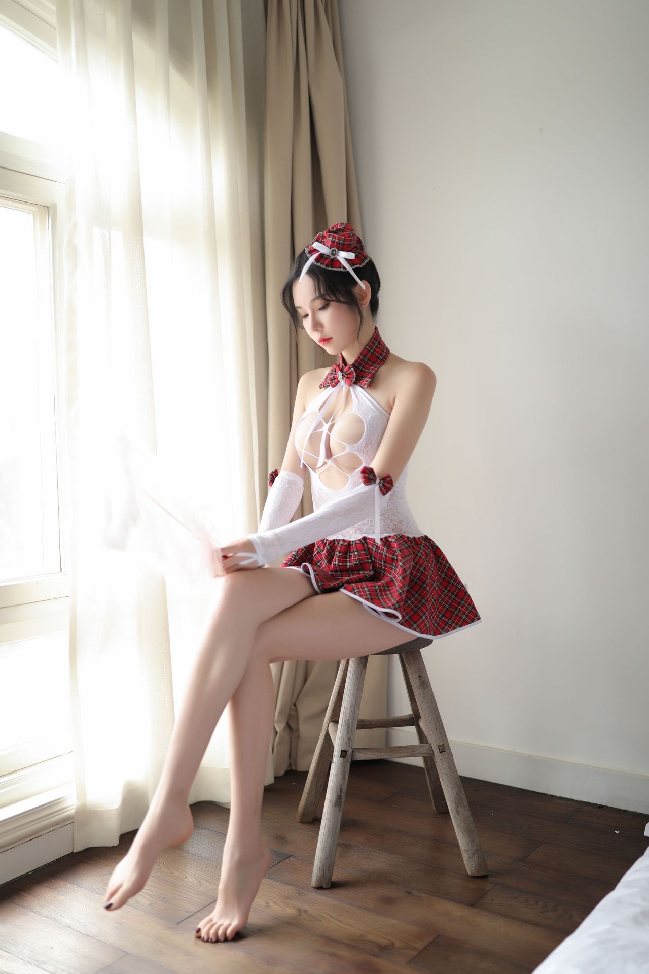 Fun student uniform one-piece net dress sexy plaid skirt